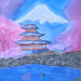 Dans cette composition, les cerisiers en fleurs dĂ©voilent leurs teintes rosĂ©es, la pagode se dresse avec Ă©lĂ©gance au bord de lâeau, et Ă lâhorizon, le Mont Fuji sâĂ©lĂšve, immobile et majestueux.