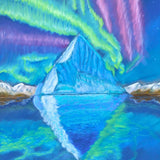 Un iceberg majestueux sâĂ©lĂšve au cĆur dâune mer dâun bleu profond, sa silhouette se reflĂšte dans les eaux calmes, crĂ©ant un jeu dâĂ©quilibre et de symĂ©trie. Au-dessus, le ciel sâembrase de lumiĂšres mouvantes : les aurores borĂ©ales dĂ©ploient leurs voiles dans des nuances de vert, de bleu et de rose.