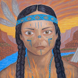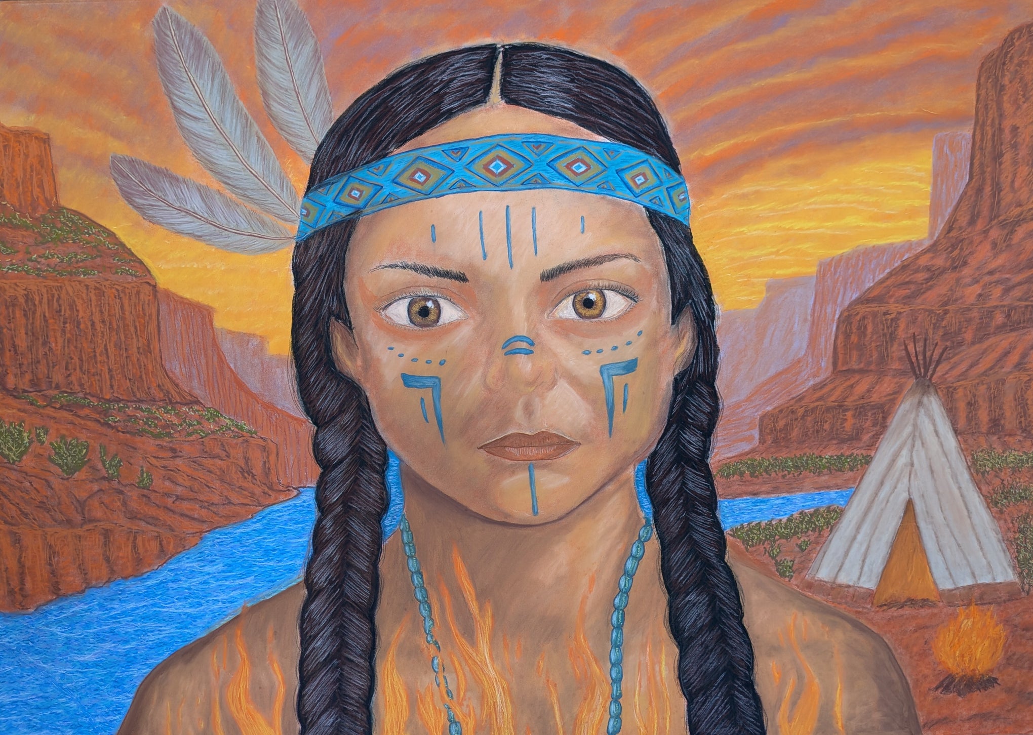 La chaleur danse autour d’elle, le canyon respire derrière elle, et le feu éclaire son corps d’une lumière brute. Ses yeux portent deux braises calmes, profondes, celles de quelqu’un qui a traversé l’épreuve et en a fait une force. Ses tatouages racontent ce que les mots ne peuvent pas dire :des chemins, des initiations, des victoires silencieuses.